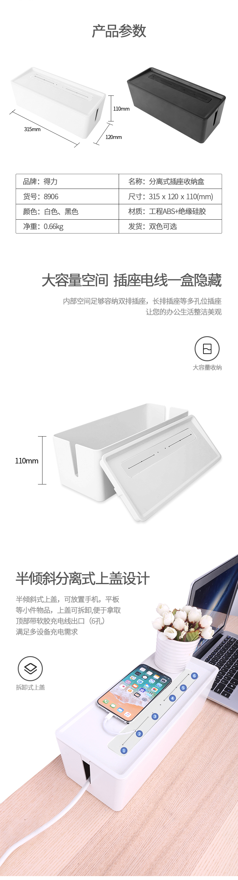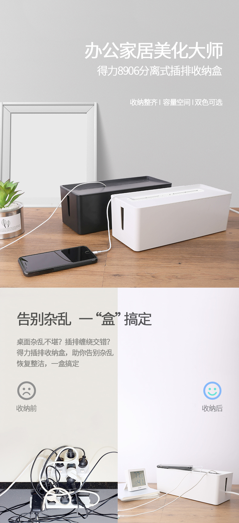 得力(deli)8906 桌面理线盒/收纳盒 插座/插线板/插排/排插/接线板/拖线板 暗夜黑